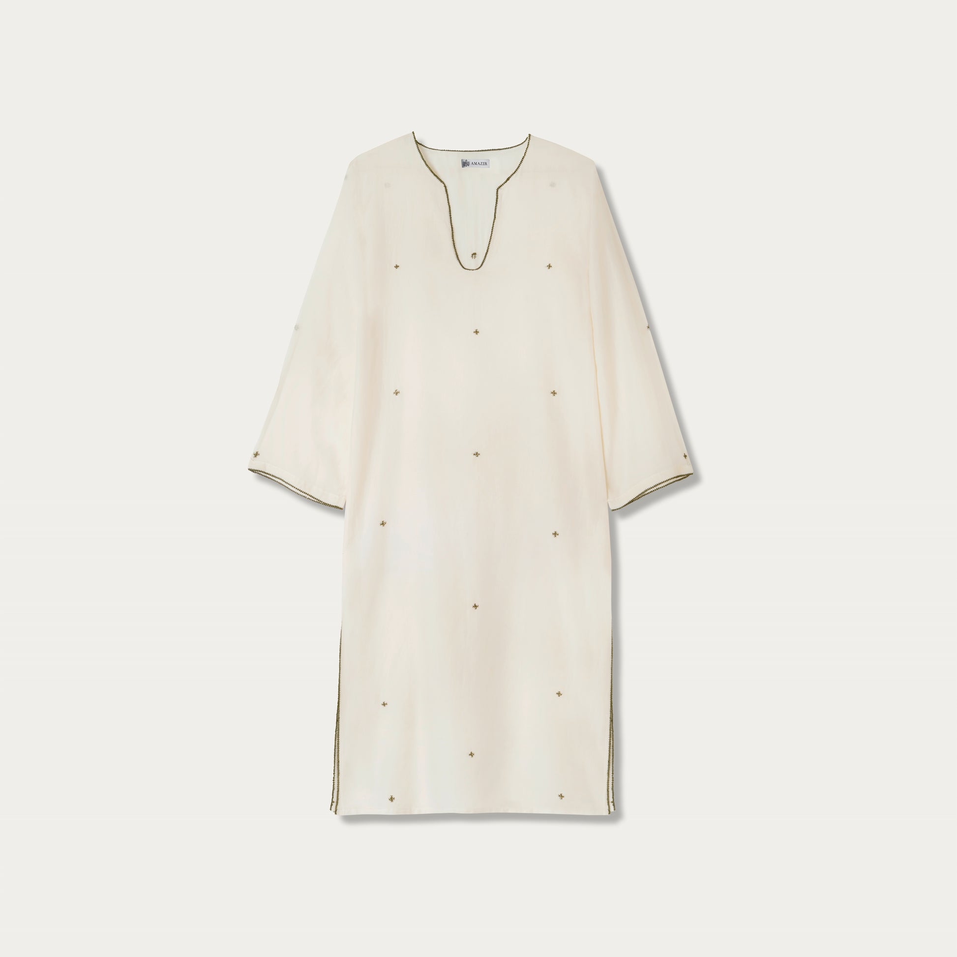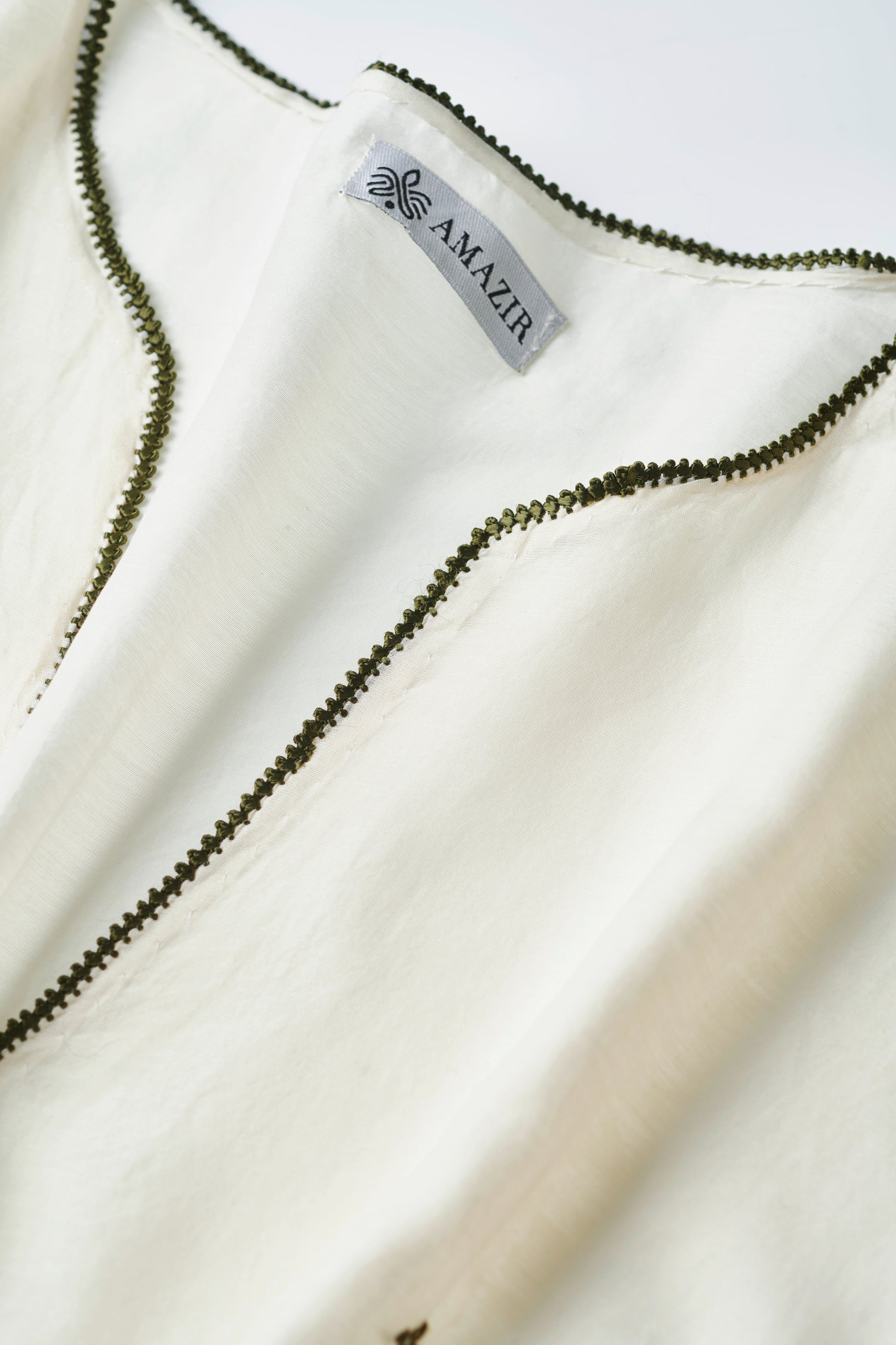 Der Amira Kaftan verbindet Eleganz mit einem freien Stil. Er hat wenige Muster, seitliche kurze Schnitte, lange Ärmel und einen V-Ausschnitt. Der leichte, durchsichtige Stoff verleiht ihm eine luftige und zarte Note.