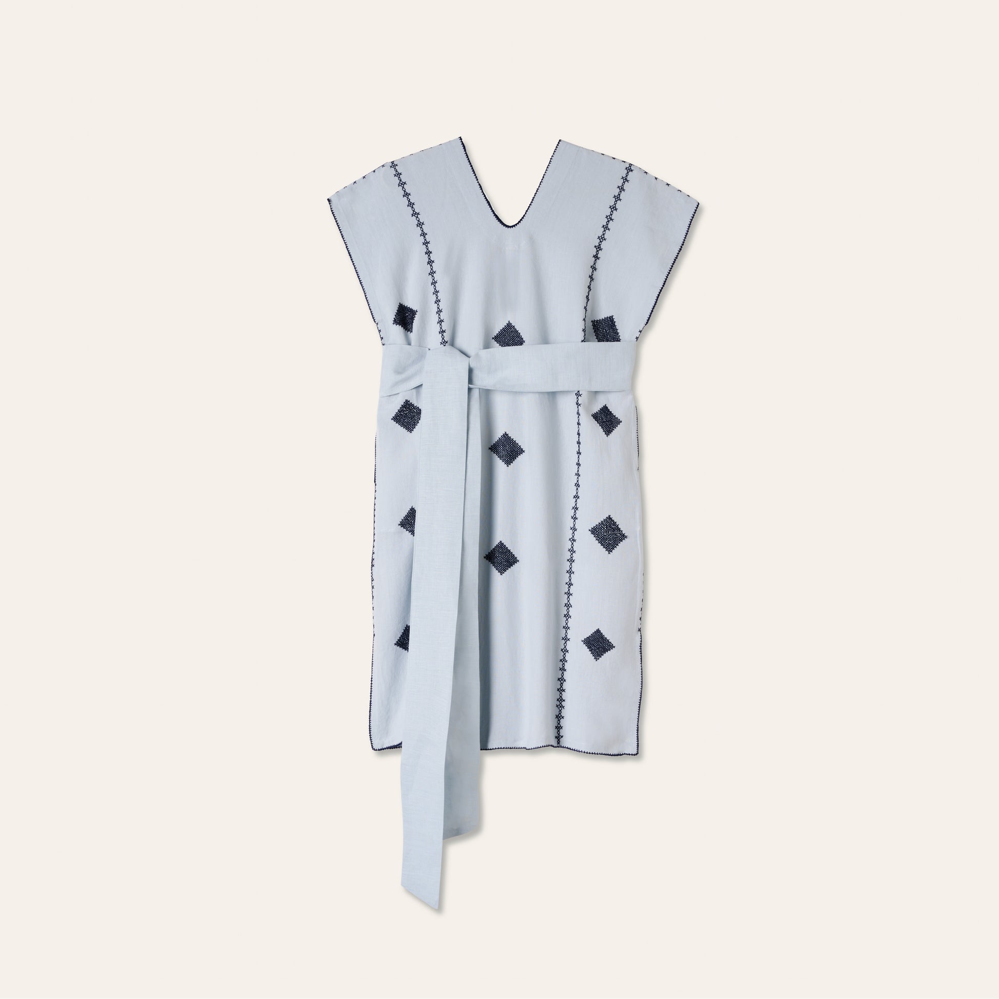 ETOILE-Mini ist ein liebevoll handgefertigter Kaftan in Mini-Länge, der durch sein minimalistisches Design mit geometrischer Stickerei besticht. Die klare Schnittführung und der breite Bindegürtel verleihen dem Look eine moderne, zugleich zeitlose Note – perfekt für warme Tage und stilvolle Auftritte mit entspannter Eleganz.