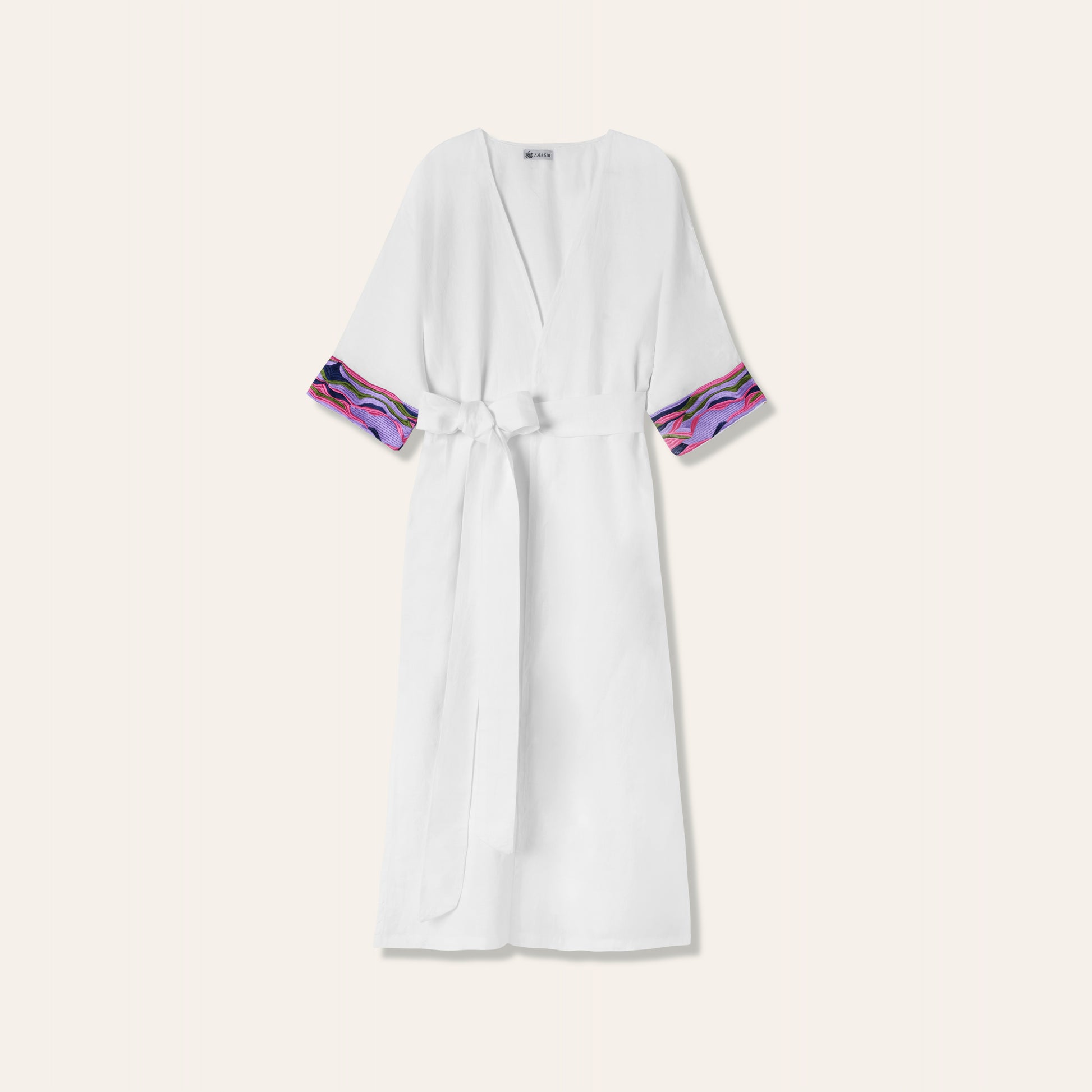 Lockerer, fließender Schnitt für höchsten Tragekomfort, veredelt mit breiten Ärmeln und farbenfrohen, handgefertigten Stickereien. Mit dem Taillengürtel kannst du die Passform individuell anpassen und deinem Look eine persönliche Note verleihen.