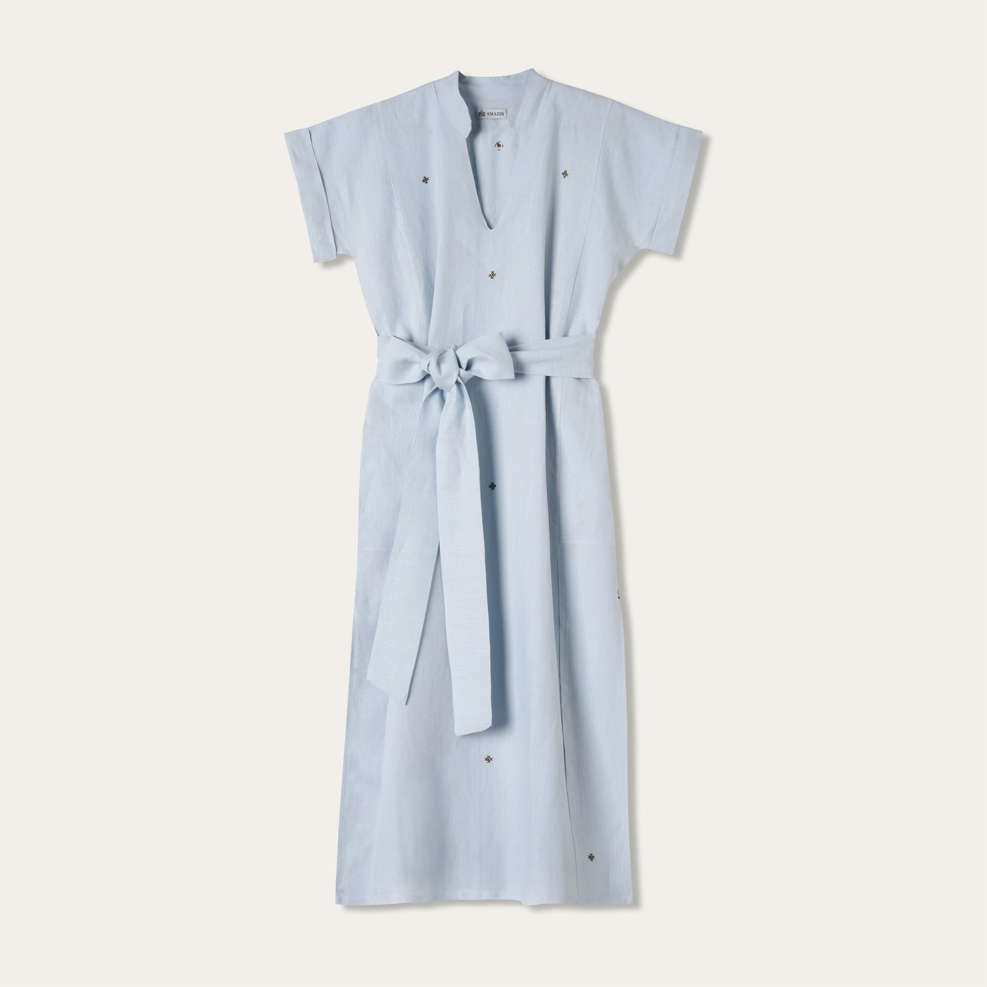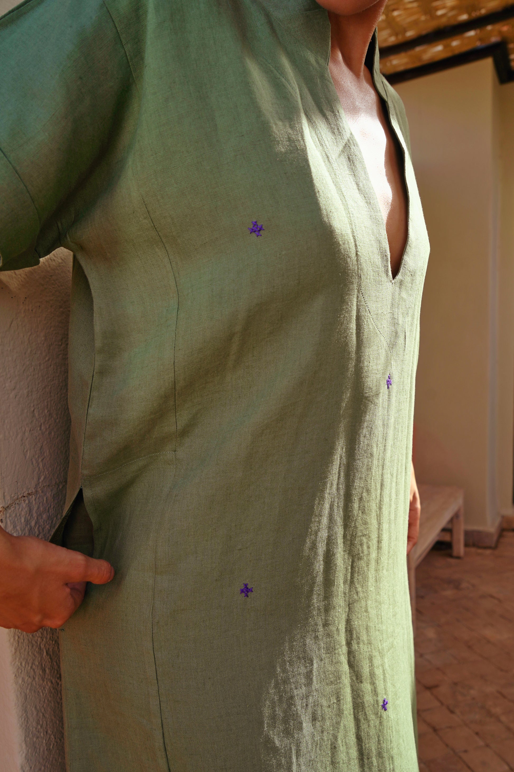 Dieser Kaftan umhüllt dich mit Leichtigkeit und schlichter Eleganz. Das dezente Muster setzt feine Akzente, während die kurzen Ärmel und der fließende Schnitt für Komfort sorgen. Der V-Ausschnitt mit sanftem Kragen verleiht eine raffinierte Note, und die praktischen Taschen machen ihn alltagstauglich. Die seitlichen Schlitze schenken Bewegungsfreiheit.