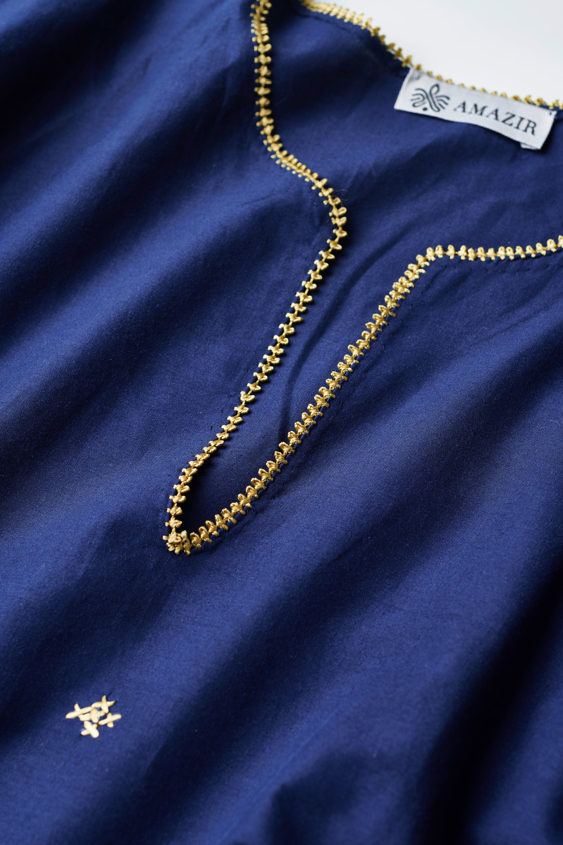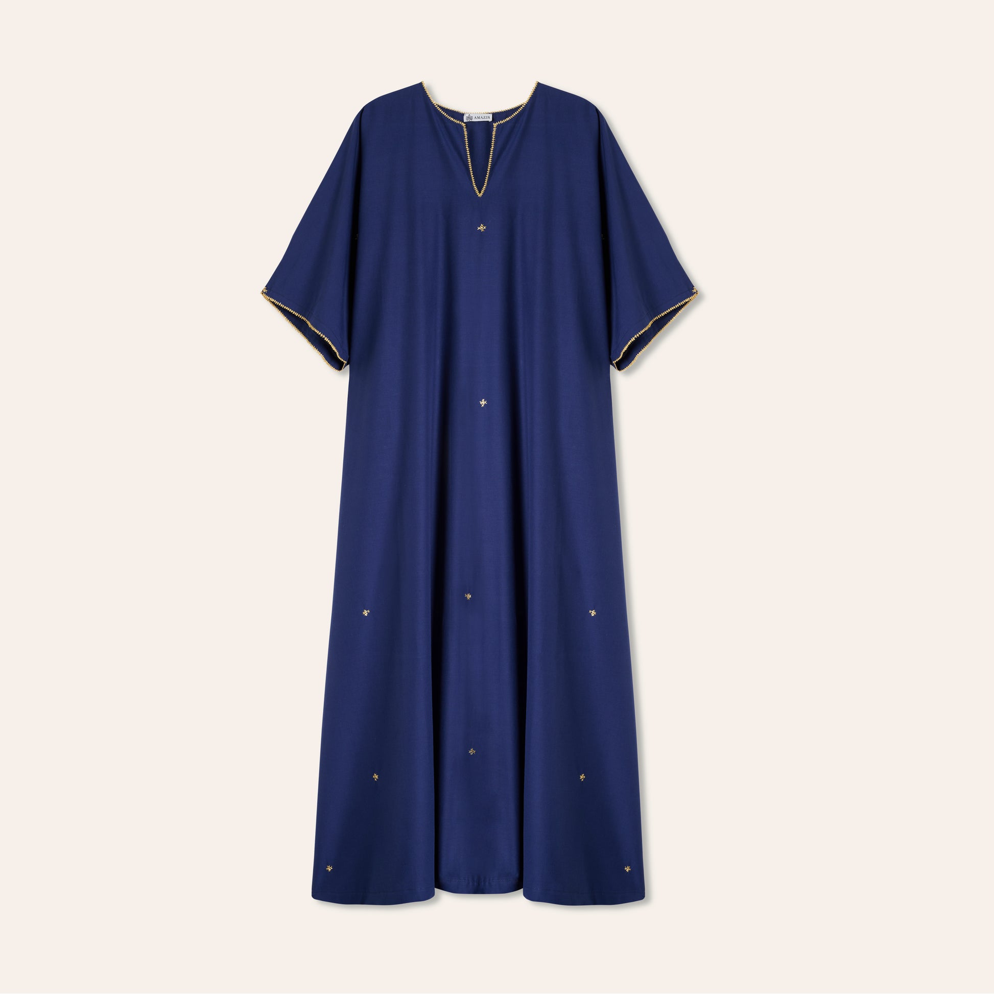 Der Kaftan ZEINA in edlem Mitternachtsblau besticht durch feine goldene Stickereien am Ausschnitt und an den Ärmeln. Zarte, handgestickte Details schmücken das gesamte Design. Ein stilvolles Statement traditioneller Eleganz von AMAZIR.